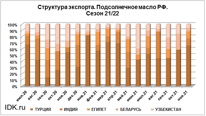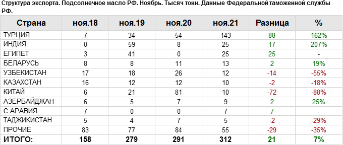 Объем поставок подсолнечного масла на экспорт за период с июля 2021 года по ноябрь 2021 года в Индию составил 113.22 тыс. тонн, что на 18.01 тыс. тонн больше объема поставок в данную страну в прошлом сезоне на тот же отчетный месяц.