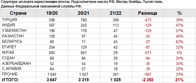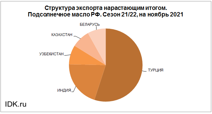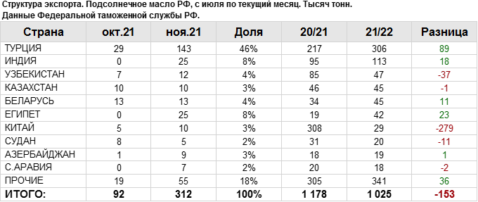 Объем поставок подсолнечного масла на экспорт за период с июля 2021 года по ноябрь 2021 года в Турцию составил 306.11 тыс. тонн, что на 88.87 тыс. тонн больше объема поставок в данную страну в прошлом сезоне на тот же отчетный месяц.