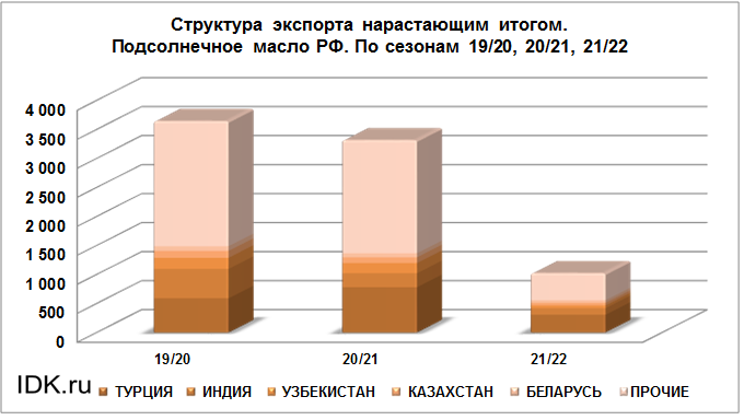Структура экспорта подсолнечного масла из России нарастающим итогом по сезонам
