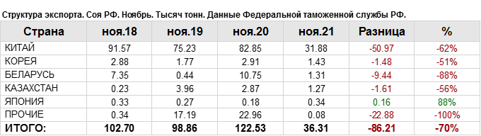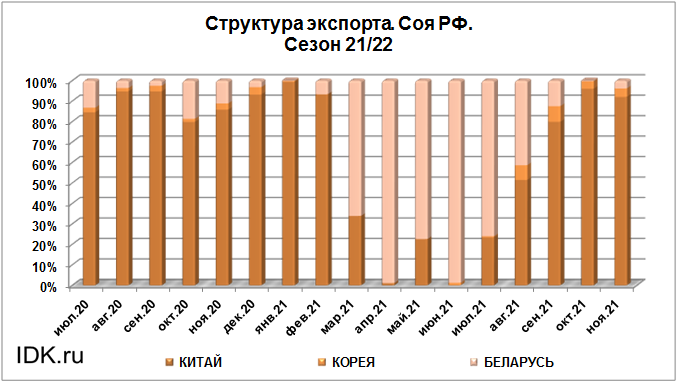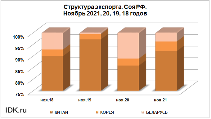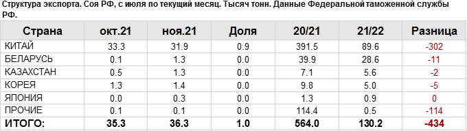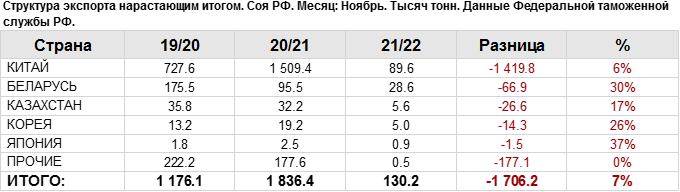 Объем поставок сои на экспорт за период с июля 2021 года по ноябрь 2021 года в Китай составил 89.57 тыс. тонн, что на -301.89 тыс. тонн меньше объема поставок в данную страну в прошлом сезоне на тот же отчетный месяц.
