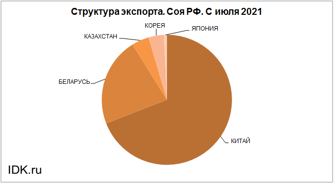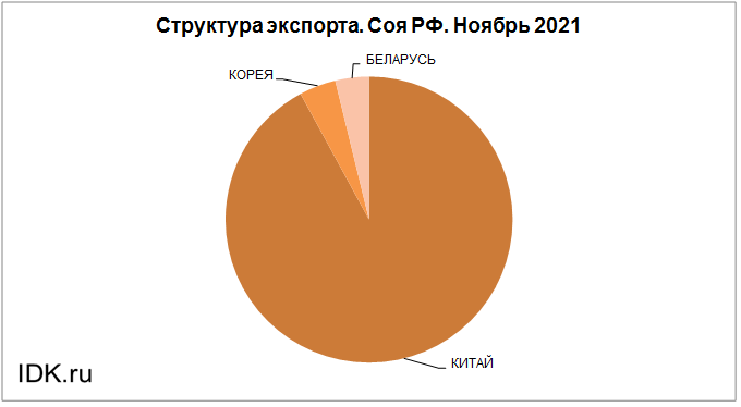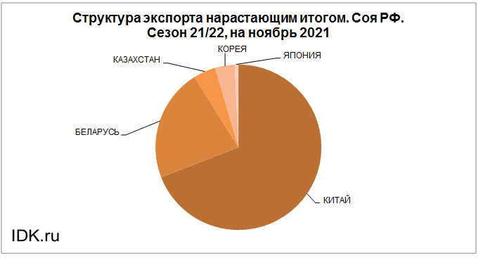 Объем поставок сои на экспорт за период с июля 2021 года по ноябрь 2021 года в Беларусь составил 28.61 тыс. тонн, что на -11.25 тыс. тонн меньше объема поставок в данную страну в прошлом сезоне на тот же отчетный месяц.