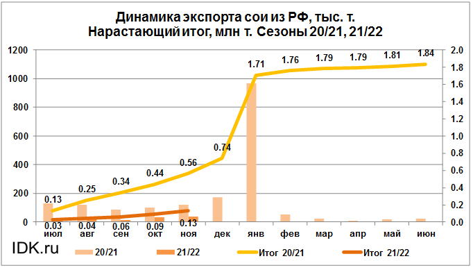 В текущем сезоне объем поставок сои на экспорт достиг 130.17 тыс. тонн. Данный объем на текущий момент составляет 7% от объема прошлого сезона.