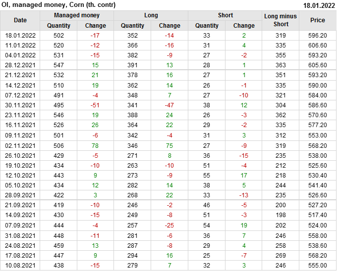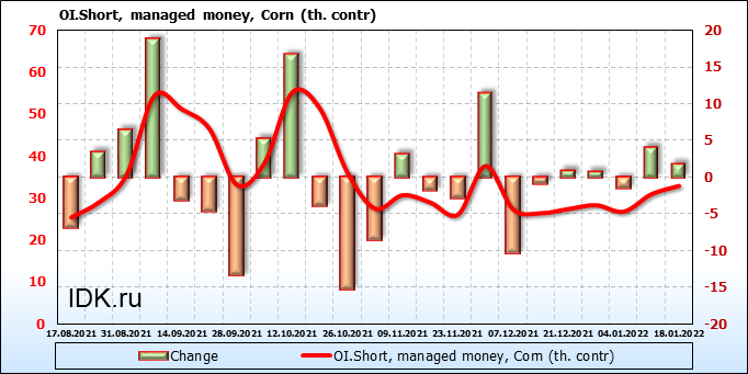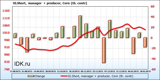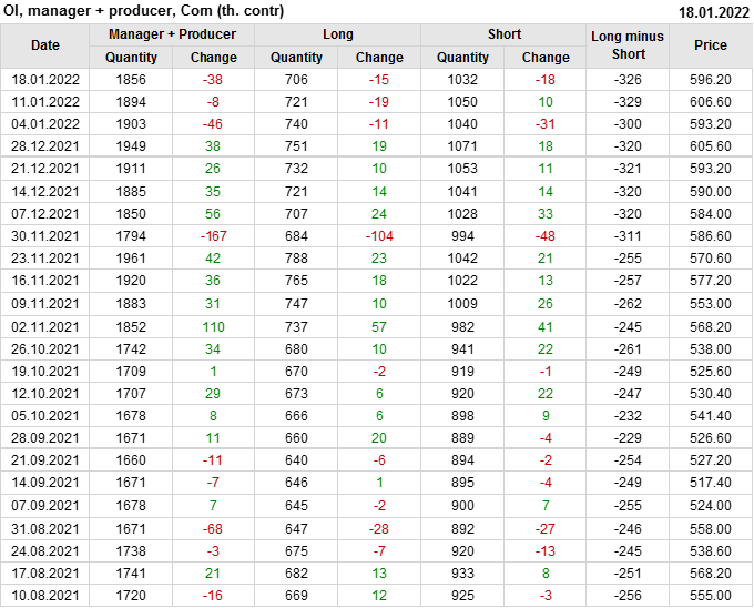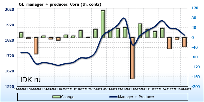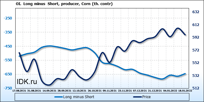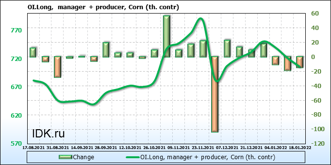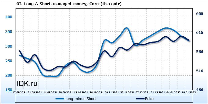 За прошлую неделю, 12.01.22 — 18.01.22, разница между длинными и короткими позициями управляющих сократилась на 15.8 тыс. контрактов. В тоже время, цена упала на 10.4 цента.