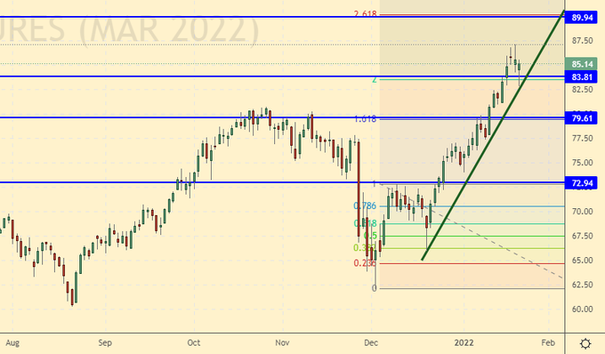 Сценарий роста: рассматриваем январский фьючерс, дата экспирации 31 января. Рынок смотрит в район 94.20. Если движение к данному уровню будет прямолинейным, без отката в район 80.00, то тогда возникнет сильная перекупленность, которая приведет к резкому падению цен в дальнейшем. Покупать не будем, нам нужен откат для входа в лонг.
