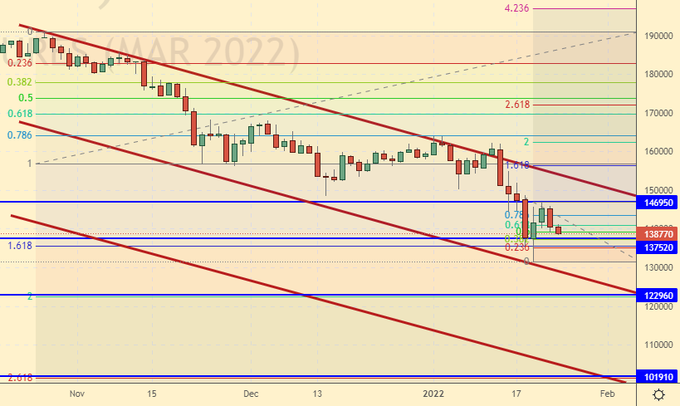 Сценарий падения: с нами будут разговаривать, это уже видно. Вопрос только, каким тоном. Вряд ли очень грозным. В Европе началась большая игра. Российская экономика может пострадать от санкций со стороны ЕС и Вашингтона, поэтому инвесторы вынуждены на данном этапе учитывать негативное развитие событий. Будем держать шорт. Цели внизу у нас на 103000 и на 80000.