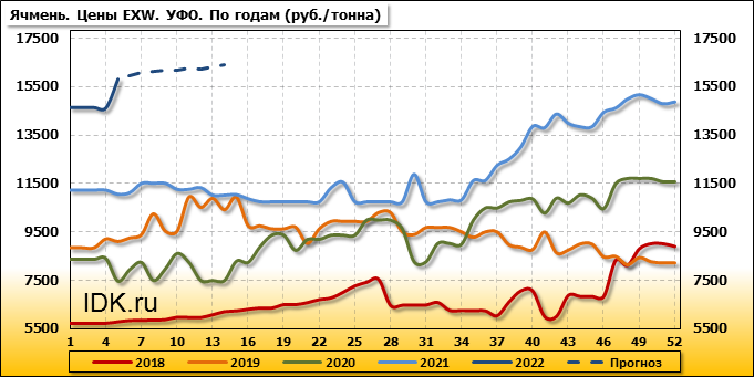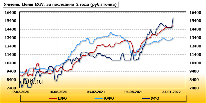 Внутренние цены на ячмень в Уральском федеральном округе выросли на 1168 руб./т. и на данный момент составляют 15799 рублей за тонну.