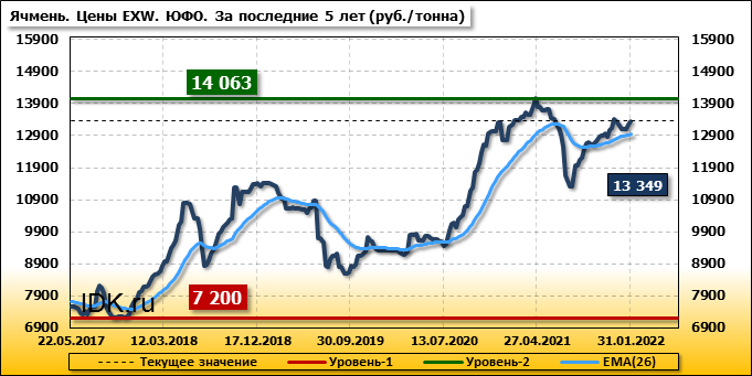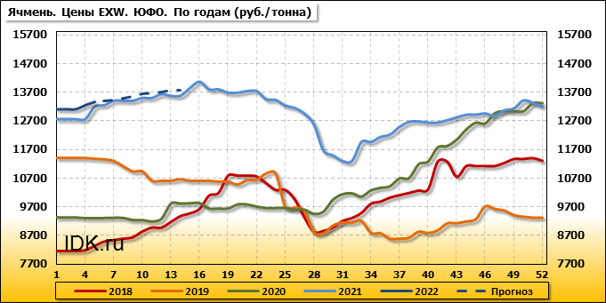 В Южном федеральном округе внутренние цены на ячмень выросли на 110 руб./т. и на данный момент составляют 13349 рублей за тонну.