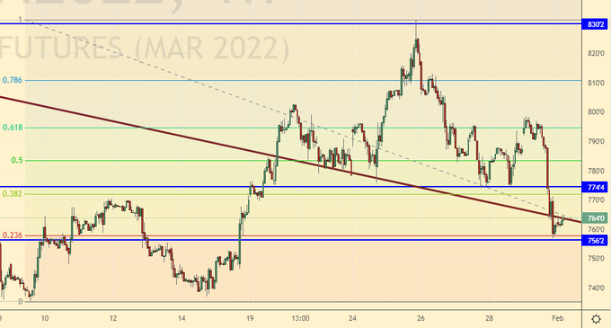 Видим пробой линии поддержки. События протекают пока над уровнем 600.0, что сохраняет шансы на продолжение роста.