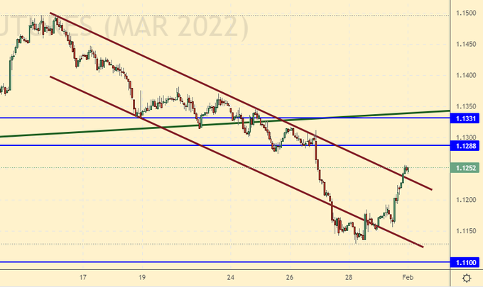 Видим, что продавцы разбегаются. 3-го числа заседание ЕЦБ, на нём могут быть произнесены слова о борьбе с инфляцией, что окажет поддержку евро. Отказ от политики нулевых ставок может привести к росту пары в район 1.2000.