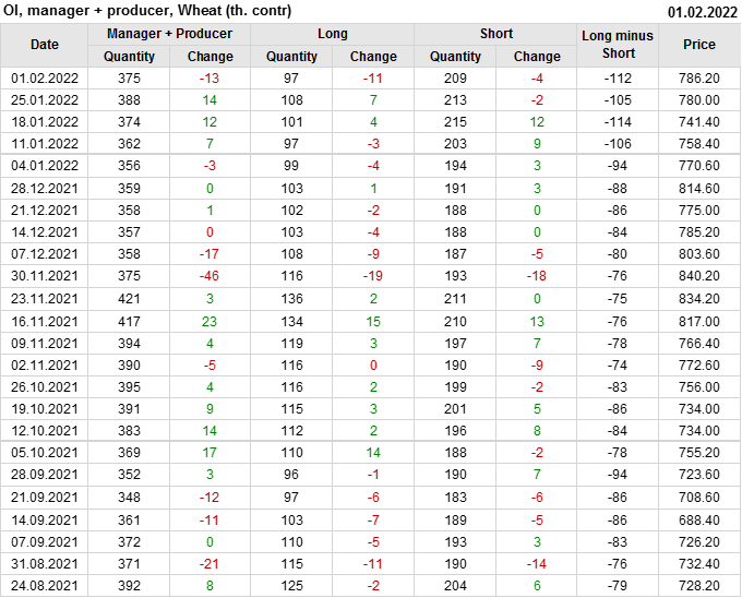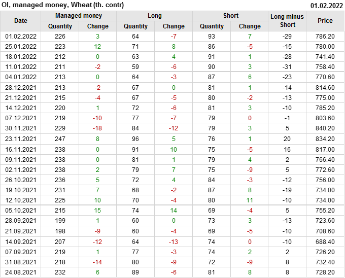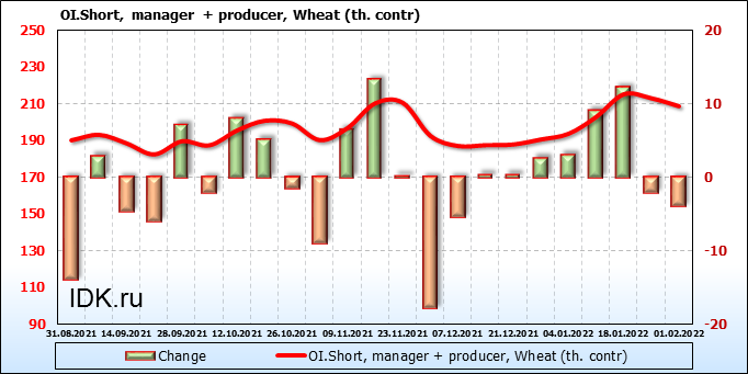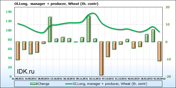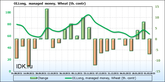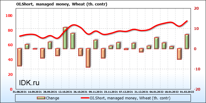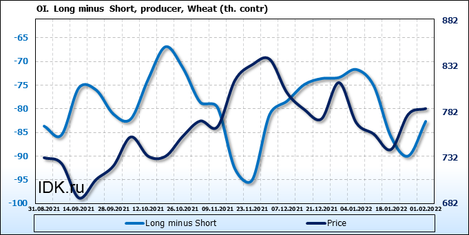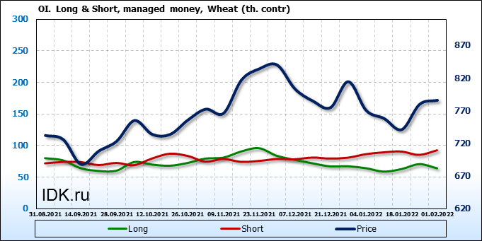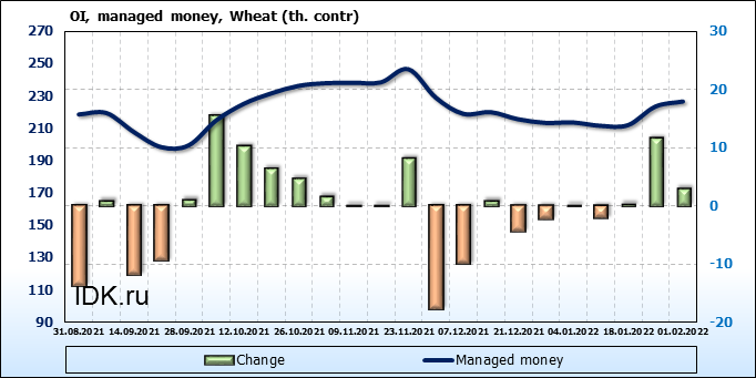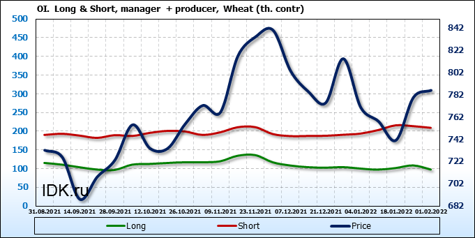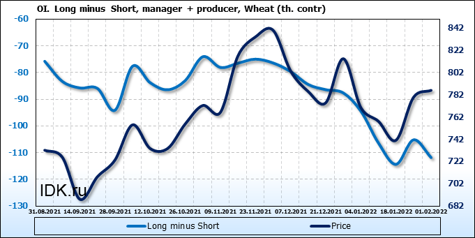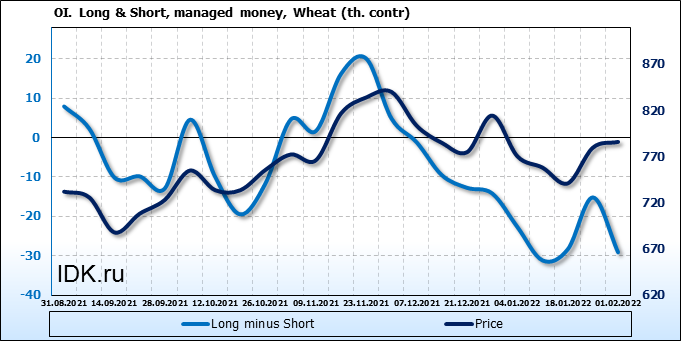 За прошедшую неделю, 26.01.22 — 01.02.22, разница между длинными и короткими позициями управляющих увеличилась на 13.9 тыс. контрактов. В тоже время, цена выросла на 6.2 цента.