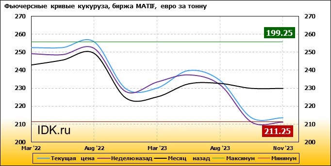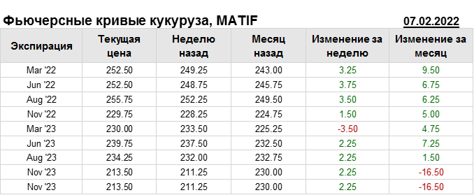 На 07.02.2022 стоимость кукурузы на бирже MATIF по контракту Mar ’22 составила 252.5 евро за тонну. За прошедшую неделю стоимость кукурузы на европейской площадке выросла на 3.25 евро/тонна. Как мы видим на графике, фьючерсная кривая имеет периоды, когда более дальний фьючерс дешевле ближнего. Состояние бэквардации наблюдаем на следующих контрактах: Nov ’22; Aug ’23; Nov ’23. Таким образом, трейдеры предполагают, что возможно превалирование предложения над спросом в указанные периоды.