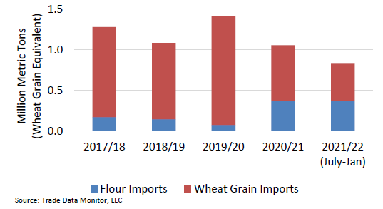 В результате Эфиопия остается нетто-импортером пшеницы, удовлетворяя около 25 процентов своего спроса за счет импорта. Большая часть импортируется правительством Эфиопии, хотя определенная часть импортируется в качестве продовольственной помощи, в том числе из Соединенных Штатов. Правительство Эфиопии объявило несколько тендеров, но вынуждено было отменить некоторые из них. Рост мировых цен на пшеницу только усугубил проблему предложения. Эфиопия уже десять лет импортирует и распределяет пшеницу по мукомольным фабрикам по субсидируемым ценам (в настоящее время 30 процентов от преобладающей внутренней цены) для стабилизации рынка. Затем мукомолы продают субсидированную муку пекарням для выпечки хлеба. Это оказывает давление на валютные резервы правительства. Сейчас, когда мировые цены почти удвоились по сравнению с двумя годами ранее, правительство не может позволить себе закупать достаточно пшеницы, чтобы удовлетворить внутренний спрос. В декабре 2021 года, в попытке более эффективно стабилизировать рынки пшеницы и сократить злоупотребление субсидированной мукой, правительство объявило о новой схеме распределения импорта, согласно которой субсидируемая мука будет продаваться мукомольными предприятиями напрямую потребителям.