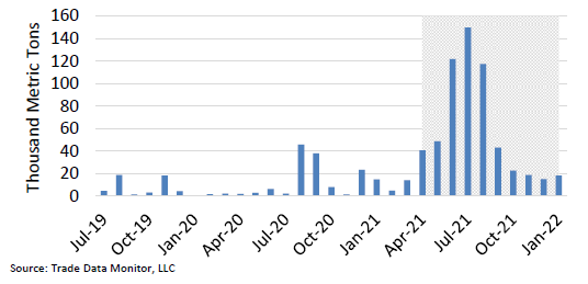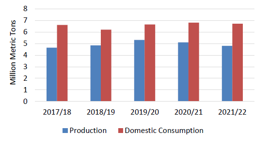 Дефицит производства привел к сокращению внутренних запасов и вызвал резкий рост импорта пшеницы в регион в 2021/22 году. Россия была основным поставщиком, учитывая ее транспортное преимущество и относительно низкие цены по сравнению с другими крупными экспортерами.
