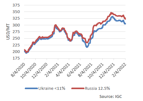 Все цены в США немного выросли после публикации январского отчета WASDE, что было вызвано сообщениями о напряженности в Черноморском регионе, сохраняющейся засушливой погоде в большинстве регионов выращивания пшеницы и логистических проблемах из-за нехватки рабочей силы. Цена на Hard Red Spring (HRS) выросла на 14 долларов за тонну по сравнению с прошлым месяцем до 416 долларов из-за сложностей железнодорожных перевозок и высоких ставок на железнодорожные услуги. Аналогичным образом Soft White Winter (SWW) поднялась на 12 долларов за тонну до 446 долларов за тонну из-за ограниченных запасов. Hard Red Winter (HRW) подорожала на 8 долларов за тонну до 377 долларов, отражая продолжительные экстремальные засушливые условия в Техасе и Оклахоме. Soft Red Winter (SRW) выросла на 8 долларов за тонну до 339 долларов.