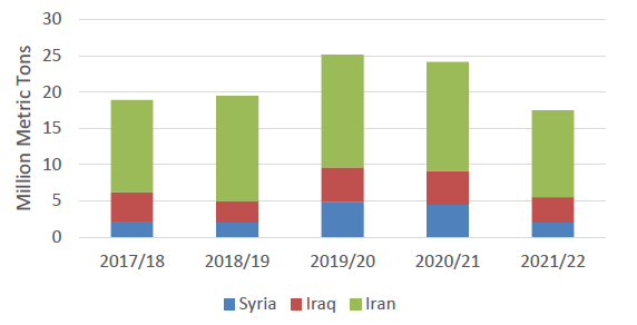 Количество осадков ниже среднего и высокие температуры резко снизили урожайность пшеницы в Иране, Ираке и Сирии. Производство пшеницы в Иране снижено в этом году на 3,0 млн тонн до 12,0 млн тонн. Производство было скорректировано в сторону понижения до 3,5 млн тонн в Ираке и 2,0 млн тонн в Сирии в этом месяце, что отражает воздействие сильной засухи.