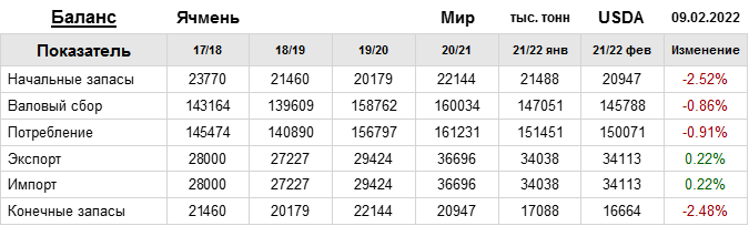 За прошедший месяц министерство сельского хозяйства США (USDA) на 09.02.2022 пересмотрело Баланс ячменя для Мира в сезоне 21/22 следующим образом: