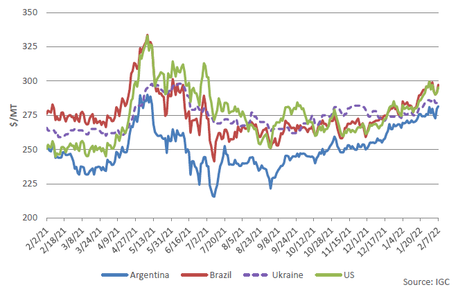 После публикации январского отчета WASDE ценовые предложения всех четырех основных экспортеров выросли. Спрос на экспорт остается высоким у Аргентины и Бразилии, в результате чего аргентинские цены выросли на 11 долларов за тонну до 282 долларов, а бразильские — на 12 долларов за тонну до 297 долларов. Несмотря на то, что дожди частично смягчили засуху в Южной Америке, потенциальное негативное воздействие на производство кукурузы сохраняется. Цены в США выросли на 14 долларов за тонну до 295 долларов из-за потенциального сокращения производства в Южной Америке, а также высокого внутреннего спроса на топливный этанол. Цены в Украине выросли на 10 долларов за тонну до 286 долларов за тонну из-за сильного снегопада, нарушившего портовые операции.