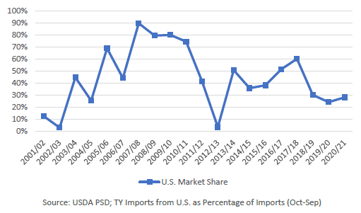 Южная Корея когда-то была рынком, на котором доминировала американская кукуруза, но в последние годы она заметно диверсифицировала своих поставщиков кукурузы. За исключением пострадавшего от засухи 2012/13 года, доля США на рынке Южной Кореи упала до самого низкого уровня с 2004/05 года. Хотя мировая торговля кукурузой по умолчанию сосредоточена у нескольких крупных и некоторых второстепенных экспортеров, Южная Корея показала свою готовность импортировать ее от самых разных поставщиков.
