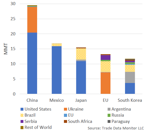 Из пяти крупнейших импортеров кукурузы в 2020/21 г. (октябрь-сентябрь) американская кукуруза доминировала в Китае, Мексике и Японии. Украина была основным поставщиком в Европейский Союз, за ней следовала Бразилия. Напротив, Южная Корея импортировала аналогичные объемы из Аргентины, Бразилии и США, а также остаточные количества от второстепенных экспортеров, таких как Россия и Парагвай.
