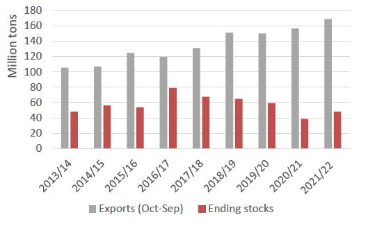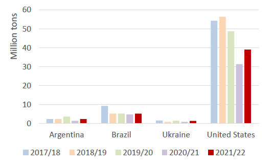 Мировая торговля кукурузой выросла благодаря растущему спросу на корма по конкурентоспособным ценам во всем мире. Аргентина, Бразилия, Украина и США являются основными поставщиками, на долю которых приходится 85 процентов мирового экспорта. Однако совокупные конечные остатки этих стран неуклонно сокращаются и в настоящее время оцениваются примерно в четверть их экспорта в 2020/21 году, что ниже, чем в среднем за последние несколько лет. Совокупные конечные остатки, согласно прогнозу, вырастут в 2021/22 году, но все еще будут относительно ограниченными в случае глобального дефицита производства или неожиданного скачка импортного спроса.