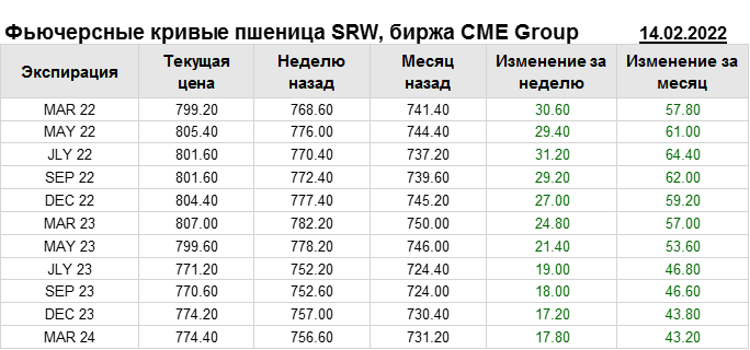 На 14.02.2022 стоимость пшеницы SRW на бирже CME Group по контракту MAR 22 составила 799.2 цента за бушель. За прошедшую неделю стоимость пшеницы SRW выросла на 30.6 цента/бушель. Как мы видим на графике, фьючерсная кривая имеет периоды, когда более дальний фьючерс дешевле ближнего. Состояние бэквардации наблюдаем на следующих контрактах: JLY 22; MAY 23; JLY 23; SEP 23. Таким образом, трейдеры предполагают, что возможно превалирование предложения над спросом в указанные периоды.