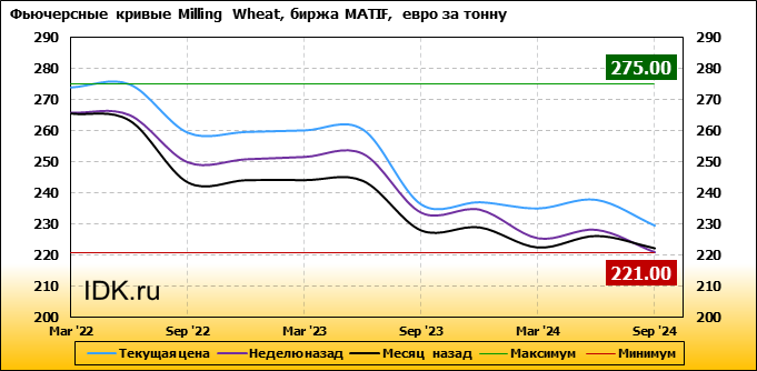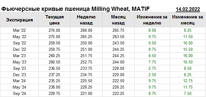 На 14.02.2022 стоимость пшеницы Milling Wheat на бирже MATIF по контракту Mar ’22 составила 274 евро за тонну. За прошедшую неделю стоимость пшеницы Milling Wheat выросла на 8 евро/тонна. Как мы видим на графике, фьючерсная кривая имеет периоды, когда более дальний фьючерс дешевле ближнего. Состояние бэквардации наблюдаем на следующих контрактах: Sep ’22; Sep ’23; Mar ’24; Sep ’24. Таким образом, трейдеры предполагают, что возможно превалирование предложения над спросом в указанные периоды.