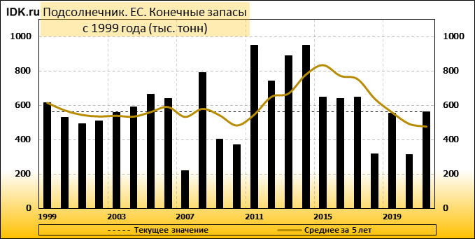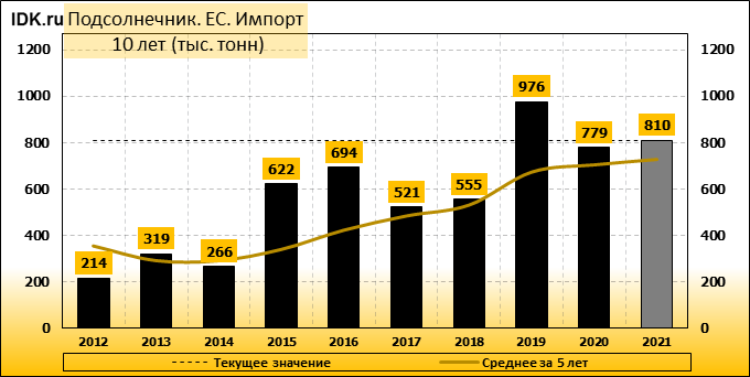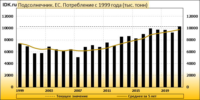 Министерство Сельского Хозяйства США оставило без изменений прогноз производства подсолнечника в ЕС в 2021/22 году на уровне 10,40 млн тонн, что на 1,55 млн. тонн или 17,50 процентов превышает производство в предыдущем году. Урожайность подсолнечника в ЕС, как и в январе, оценивается в 2,36 т/га. Прогноз уборочной площади также не изменился и составляет 4,41 млн га. Прогноз по импорту подсолнечника в ЕС в 2021/22 году не изменился по сравнению с прошлым месяцем и составляет 810 тыс. тонн, прошлогодний объем импорта оценивается в 779 тыс. тонн.