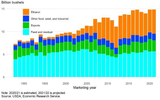 В февральском отчете WASDE также не внесено изменений в прогнозируемое потребление кукурузы в Соединенных Штатах по сравнению с январским отчетом, которое прогнозировалось на уровне 14 835 миллионов бушелей. Этот текущий прогноз будет рекордным общим объемом потребления с небольшим увеличением на 0,1 процента по сравнению с оценкой потребления на 2020/21 год.