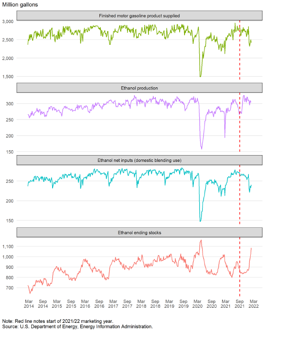 Рисунок 2. Еженедельные объемы поставок топлива, производства и остатков этанола в США.