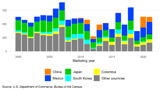 По данным Бюро переписи США, экспорт кукурузы с сентября по декабрь 2021 года составил 630 млн бушелей, что лишь немного отстает от уровня предыдущего года, составившего 632 млн бушелей. Однако в 2020/21 году поставки в Китай более чем вдвое превышали темпы текущего года до декабря. Кроме того, дополнительные закупки китайских импортеров кукурузы в январе и феврале 2021 года в конечном итоге привели к увеличению отгрузок в весеннем квартале 2020/21 года, в то время как перспективы мирового производства кукурузы на момент продаж снижались. На 2021/22 год перспективы мирового производства кукурузы выглядят намного лучше, особенно в Украине, которая исторически была крупнейшим поставщиком в Китай. При условии нормальных погодных условий в предстоящие месяцы для ключевых производителей в Южной Америке прогнозируется, что Соединенные Штаты не увидят такого же роста экспорта, как год назад. Тем не менее, текущий прогноз будет представлять собой второй по величине общий объем экспорта кукурузы для Соединенных Штатов, если он будет реализован.