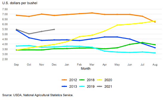 Прогнозируется, что средняя сезонная цена на кукурузу в США составит 5,45 доллара за бушель в 2021/22 году, без изменений по сравнению с прогнозом январского отчета WASDE. Ежемесячные цены, полученные производителями, остаются высокими по историческим меркам, как сообщается в отчете NASS о сельскохозяйственных ценах. Средняя цена по стране, полученная в декабре 2021 года, составила 5,47 доллара за бушель по сравнению с 3,97 доллара в декабре 2020 года. Текущий прогноз является самым высоким с 2012/13 маркетингового года и составляет 6,89 доллара за бушель, из-за сильной засухи в Кукурузном поясе, сильно сократившей рыночное предложение.
