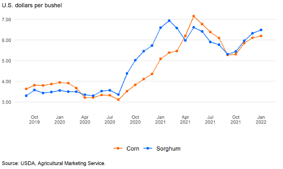 Высокий спрос на фуражное зерно поддерживает наличные цены на сорго с начала нового маркетингового года в сентябре 2021 года. Средняя наличная цена на сорго составляла 6,49 доллара за бушель в январе 2022 года по сравнению с 6,32 доллара за бушель для кукурузы. Хотя исторически цены на сорго, как правило, ниже, чем цены на кукурузу, это соотношение было изменчивым за последние 2 маркетинговых года. Цены на сорго в среднем были на 1,27 доллара за бушель выше, чем на кукурузу с сентября 2020 года по март 2021 года на наличном рынке Канзас-Сити, штат Миссури, что в значительной степени было обусловлено ростом экспорта сорго в Китай. Поскольку во второй половине 2020/21 маркетингового года запасы кукурузы сократились, с апреля 2021 года по сентябрь 2021 года цена на кукурузу была выше, чем на сорго, при этом средняя надбавка к сорго составляла 0,39 доллара США. Разница в цене между кукурузой и сорго снова была в пользу сорго в 2021/22 году, но сократилась по сравнению с 2020/21 годом. Наличные цены на сорго в Канзас-Сити были в среднем на 0,17 доллара за бушель выше, чем наличные цены на кукурузу в Канзас-Сити в период с сентября 2021 года по январь 2022 года.