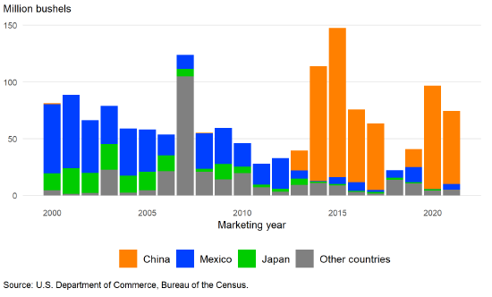 Единственным исключением из расширения экспортного рынка стал Китай. В 2012/13 г. Украина впервые экспортировала кукурузу в Китай, и в течение 2 лет (2014/15 г.) Украина стала крупнейшим поставщиком кукурузы в страну, вытеснив США и поставляя (в любой отдельный год) от 60 до почти 90 процентов китайского импорта. Когда (в 2020 году) спрос Китая на импортную кукурузу резко вырос, и ее импорт увеличился почти в четыре раза, страна стала крупнейшим экспортным направлением для Украины, впервые опередив Европейский Союз. В 2021/22 году (за период с октября по декабрь) около 30 процентов экспорта кукурузы из Украины пришлось на Китай, по сравнению с примерно 40 процентами за тот же период год назад, что предполагает, что Украина экспортирует около трети своей кукурузы в Китай в этом году, напрямую конкурируя с Соединенными Штатами. В годы рекордного производства (такие, как текущий) Украина также экспортирует кукурузу на чувствительный к ценам рынок Южной Кореи, частично вытесняя США — еще один пример прямой конкуренции между двумя странами.