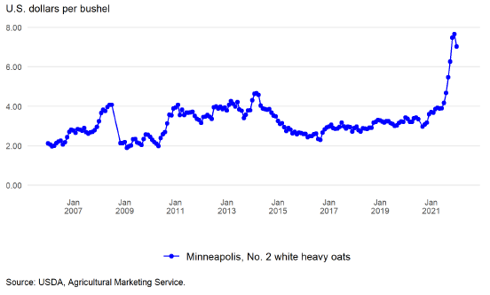 На рынке овса в США по-прежнему наблюдаются рекордно высокие уровни цен, поскольку засушливые условия как на северных равнинах США, так и в регионах канадских прерий сократили предложение в Северной Америке в 2021/22 году. В февральском отчете WASDE не внесено изменений в прогнозах предложения и потребления на 2021/22 год по сравнению с январским отчетом. Прогнозируется, что конечные остатки в США в 2021/22 году составят 28 миллионов бушелей при прогнозируемом соотношении остатков к потреблению 22,0 процента, что будет самым низким показателем с 2013/14 года. Однако, в отличие от того года, прогноз импорта находится на значительно более низком уровне, поскольку запасы овса в Канаде также ограничены. В результате прогнозируется, что средняя за сезон фермерская цена на овес в 2021/22 году составит 4,00 доллара за бушель, что выше прогноза январского отчета WASDE в 3,80 доллара. В случае реализации прогноза эта цена станет рекордной, побив текущий рекорд в 3,89 доллара, установленный в сезоне 2012/13. Иллюстрируя высокие цены на рынке овса, спотовая цена на овес в Миннеаполисе, штат Миннесота, по данным Службы сельскохозяйственного маркетинга (AMS), в январе составляла в среднем 7,06 доллара за бушель; что немного ниже среднего показателя в 7,66 доллара в декабре 2021 года, но все же более чем в два раза превышает уровень цен, наблюдавшийся за предыдущие 5 лет.