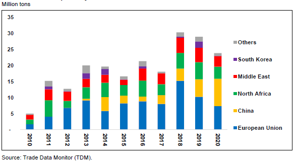 Рост экспорта кукурузы из Украины не совпал с диверсификацией ее экспортных рынков, за некоторыми исключениями. Скорее, Украина значительно расширила объемы экспорта кукурузы в страны, в которые она регулярно поставляла в течение последних 5-10 лет. Экспорт кукурузы в Европейский Союз увеличился с менее чем 2 млн тонн в 2010 году до более 15 млн тонн в 2018 году (урожайный год для производства кукурузы), при этом Испания и Нидерланды стали основными европейскими направлениями для украинской кукурузы. Экспорт крупным традиционным клиентам, таким как Египет, другие страны Северной Африки, Иран и Турция, также резко увеличился.