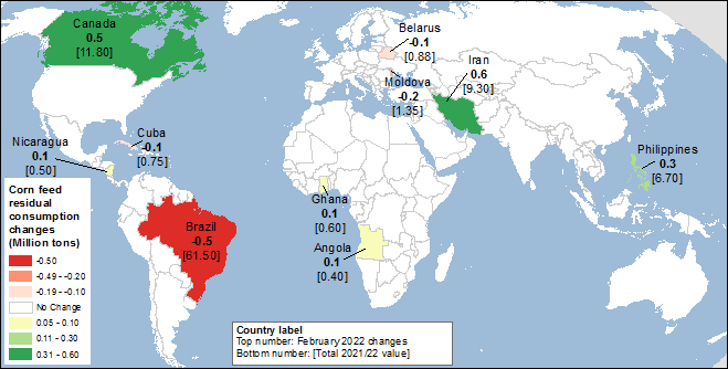 Ожидается, что рост импорта повысит кормовое потребление кукурузы в Канаде и Иране, а также потребление ячменя в качестве корма в Китае, в то время как сокращение импорта ячменя снизит кормовое потребление в Саудовской Аравии. Ожидается, что изменения в прогнозируемом производстве кукурузы ограничат кормовое потребление кукурузы в Бразилии и Молдове, но повысят его на Филиппинах. Сокращение производства ячменя, согласно прогнозу, приведет к снижению кормового потребления в Ираке, Сирии и Великобритании. В этом месяце для разных стран и культур внесены многочисленные, частично компенсирующие друг друга изменения. Изменения кормового и остаточного потребления кукурузы по странам в этом месяце наглядно представлены на карте 1.