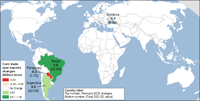В январе 2022 года экспорт кукурузы из Бразилии оказался выше, чем ожидалось. Бразильский 2020/21 местный маркетинговый год начался в марте 2021 года и закончится в феврале 2022 года, при этом январь 2022 года является частью как местного 2020/21 года, так и 2021/22 международного торгового года. Следовательно, экспорт кукурузы повышен на 1,0 млн тонн для обоих, до 20,5 млн тонн для 2020/21 местного года и 32,0 млн тонн для 2021/22 торгового года. Экспорт для торгового года увеличен, несмотря на плохой урожай сафриньи. Бразилия в основном экспортирует кукурузу, выращенную в Центрально-Западном регионе, где производится большая часть кукурузы второго урожая.