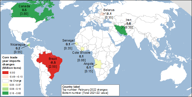 Карта 3. Основные изменения импорта кукурузы для 2021/22 торгового года (млн. тонн), февраль 2022.