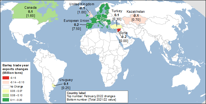 Карта 4. Основные изменения экспорта ячменя для 2021/22 торгового года (млн. тонн), февраль 2022.