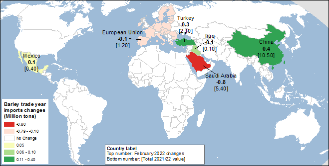 Карта 5. Основные изменения импорта ячменя для 2021/22 торгового года (млн. тонн), февраль 2022.