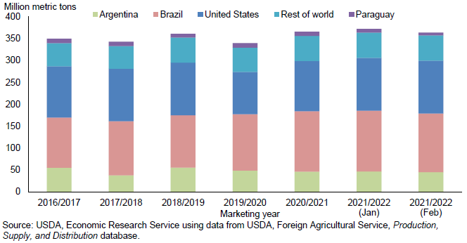 Прогноз мирового производства сои на 2021/22 год снижен на 8,7 млн метрических тонн в этом месяце до 363,86 млн метрических тонн. Ожидается, что жара и засуха в январе в основных странах-производителях сои в Южной Америке повлияют на потенциальную урожайность сои. Оценки урожая сои в Аргентине, Бразилии и Парагвае снижены до 45 млн, 134 млн и 6,3 млн метрических тонн соответственно. Прогнозируемое сокращение производства сои в этих странах, как ожидается, снизит экспорт в совокупности на 5,7 млн метрических тонн, при этом для Аргентины и Парагвая — на 1,1 млн, а для Бразилии — на 3,5 млн.