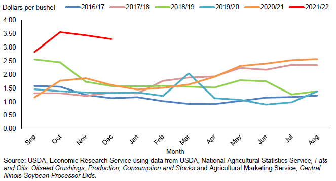 Напротив, внутренняя переработка соевых бобов продолжает расти высокими темпами, чему способствует высокая маржа переработки. Несмотря на рост цен на наличном рынке, переработчики в США сохранили возможность закупать соевые бобы. За ралли следует рост цен на продукцию, поддерживающий стабильную маржу переработки. Как показано на рисунке 2, маржа переработки в Центральном Иллинойсе является максимальной в новейшей истории и в среднем составила около 3,30 доллара за бушель в первые четыре месяца 2021/22 маркетингового года.
