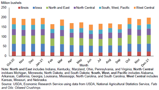 Учитывая рекордный объем переработки в декабре 2021 года, было бы интересно рассмотреть потенциальные мощности существующих действующих заводов. Если заводы во всех регионах переработают рекордный объем соевых бобов за 31 день, то ежемесячный объем переработки составит 201,67 млн бушелей, а ежедневный объем переработки составит 6,51 млн бушелей. Если дополнительно учесть, что переработчики используют свои мощности на уровне от 87 до 92 процентов, это будет означать, что среднесуточная производительность переработки составляет от 7,47 млн до 7,07 млн бушелей соответственно. Поскольку переработчикам требуется время простоя для технического обслуживания оборудования, то с учетом 345 рабочих дней возможности переработки сои в США находятся в диапазоне от 2,45 до 2,6 млрд бушелей.