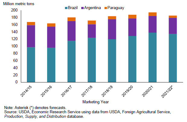 В производстве сои в Парагвае ожидается значительная потеря в размере 2,2 млн метрических тонн, поскольку затяжная засуха и экстремальные температуры повредили большую часть урожая. По прогнозам, уборочные площади сократятся на 400 000 га до 2,8 млн, в результате чего объем производства составит 6,3 млн метрических тонн. Из-за меньшего объема доступной сои прогноз экспорта сои на 2021/22 год снижен на 1,1 миллиона метрических тонн до 4,15 миллиона. Ожидается, что это сокращение повлияет на основного торгового партнера Парагвая, Аргентину. Кроме того, оценка переработки сои в 2021/22 году снижена на 0,9 млн метрических тонн до 2,2 млн.