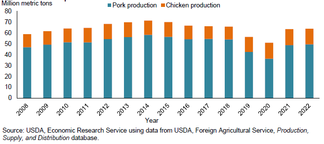 Медленный экономический рост в Китае повлиял на внутренний спрос на мясо, особенно курицу и свинину, и, как следствие, на производство. Хотя африканская чума свиней (АЧС) привела к снижению внутреннего производства свинины по сравнению с предыдущими годами, в 2021 году оно восстановилось. Однако, как показано на рисунке 5, ожидается, что производство свинины и курятины останется относительно неизменным в 2022 году, что немного ниже, чем совокупное производство 10 лет назад (2012 год).