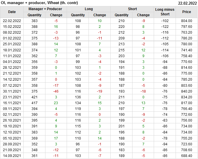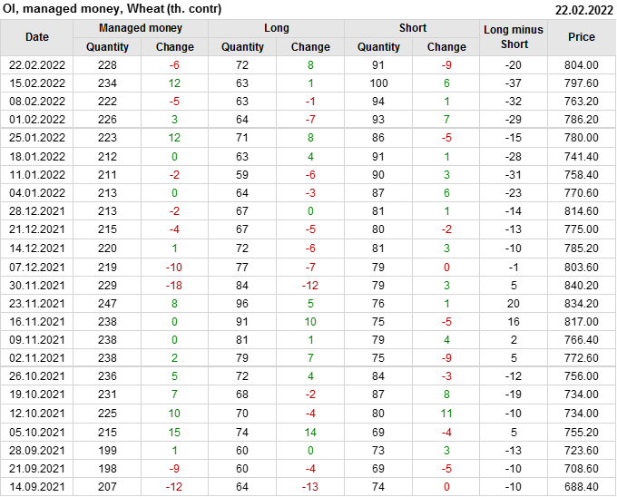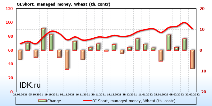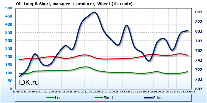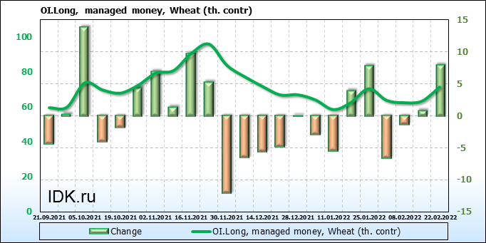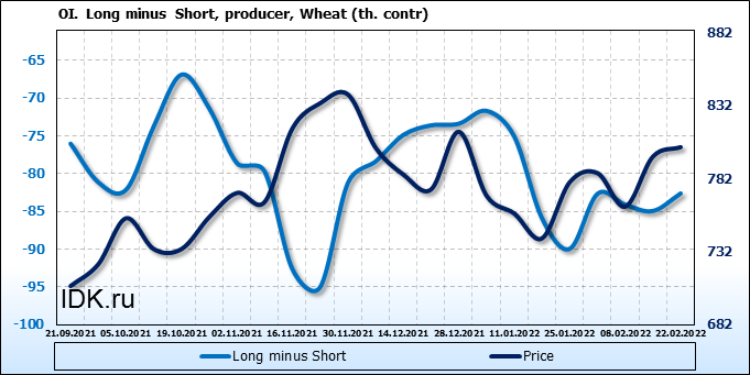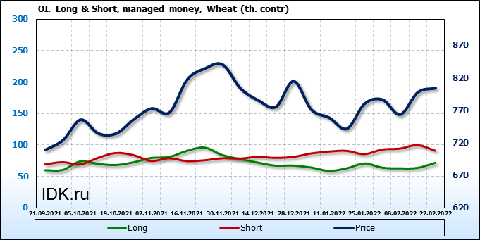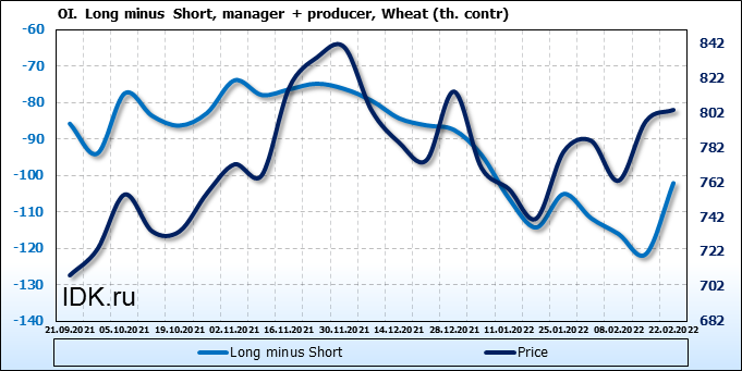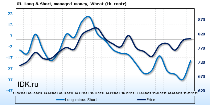 За прошедшую неделю, 16.02.22 — 22.02.22, разница между длинными и короткими позициями управляющих сократилась на 17.1 тыс. контрактов. В тоже время, цена выросла на 6.4 цента.