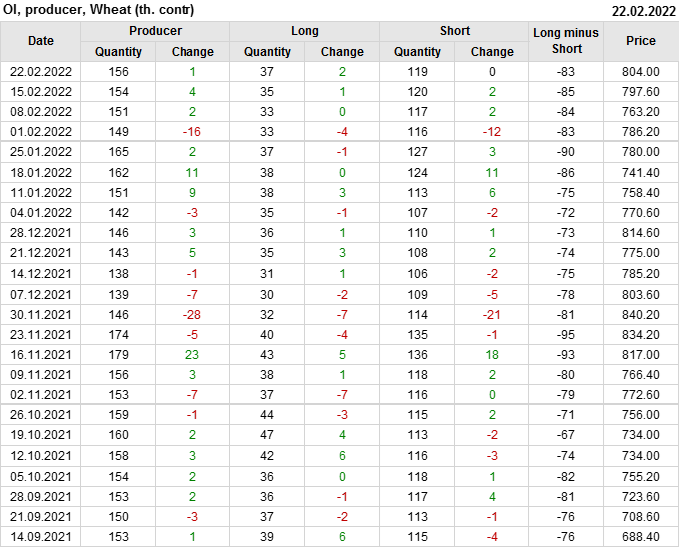 Открытый интерес производителей вырос на 1 тыс. контрактов. Объем контрактов, направленных на хеджирование, составляет 155 755 штук. Деньги производителей в течение прошлой недели приходили на рынок поддерживая тенденцию.