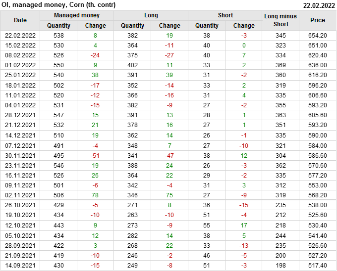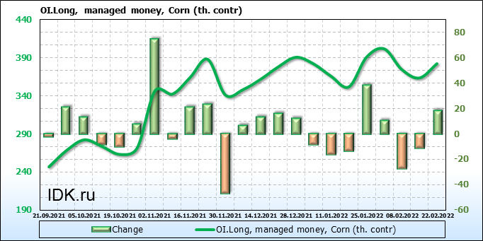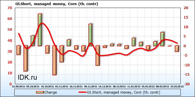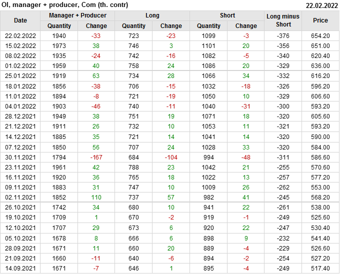 За прошлую неделю, 16.02.22 — 22.02.22, разница между длинными и короткими позициями управляющих увеличилась на 21.6 тыс. контрактов. В тоже время, цена выросла на 3.2 цента.