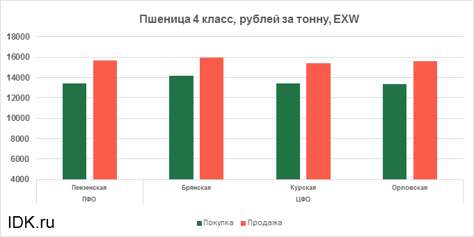 За прошедшую неделю с 21.02.2022 по 25.02.2022 средняя цена на пшеницу 4-го класса, согласно выставленным заявкам трейдеров, выросла по всем округам на 438 рублей. Средняя цена составляет 14605 рублей за тонну.