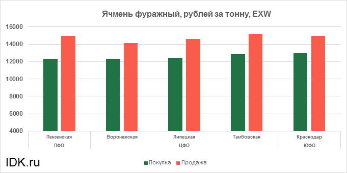 За прошедшую неделю с 21.02.2022 по 25.02.2022 средняя цена на фуражный ячмень, согласно выставленным заявкам трейдеров, упала по всем округам на 60 рублей. Средняя цена составляет 13726 рублей за тонну.